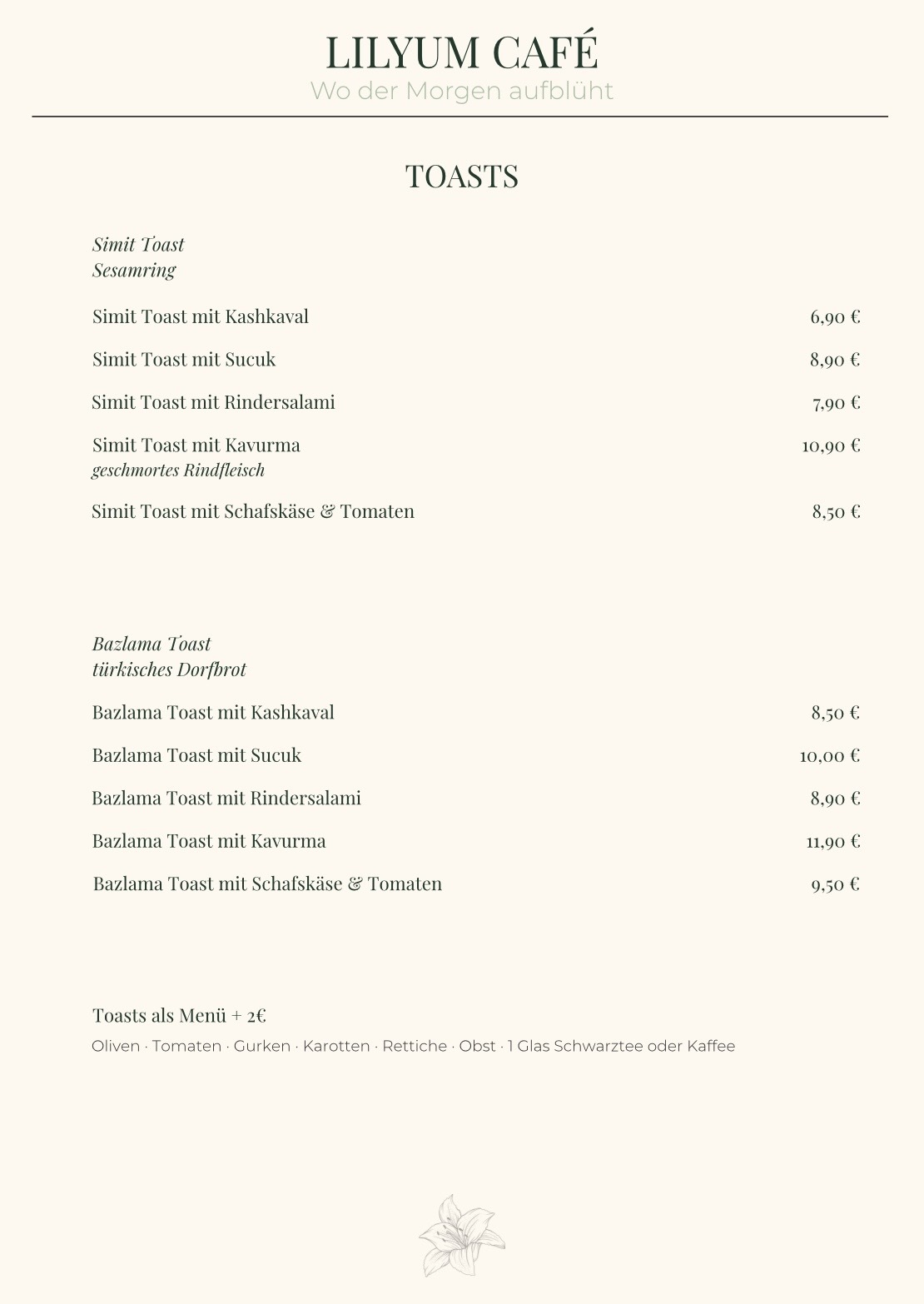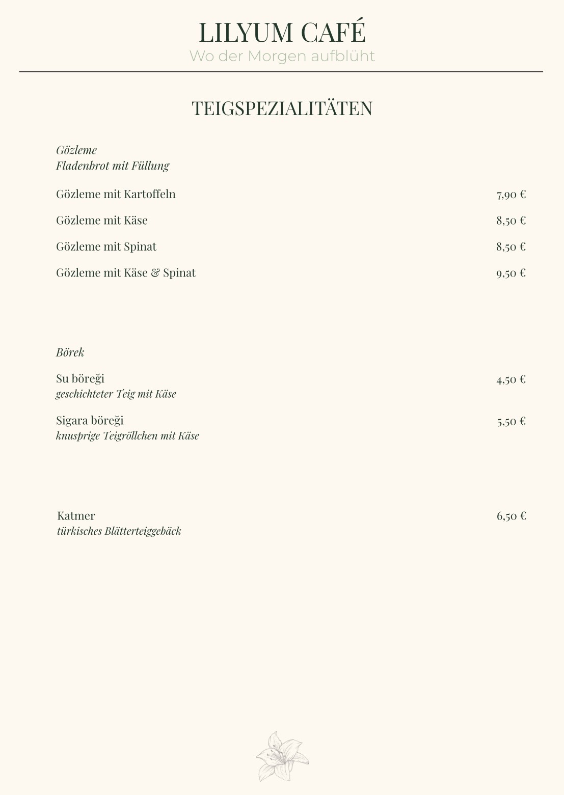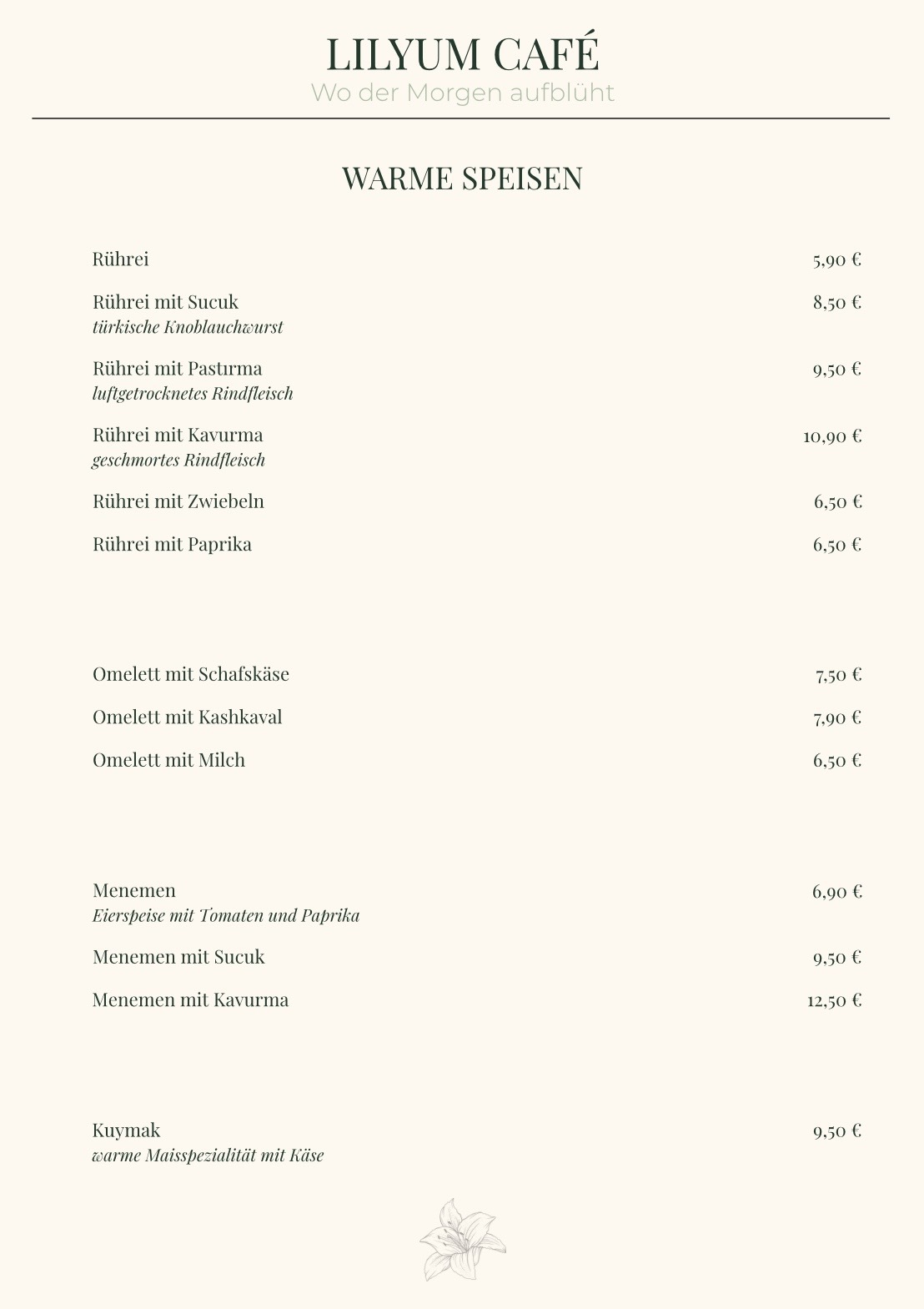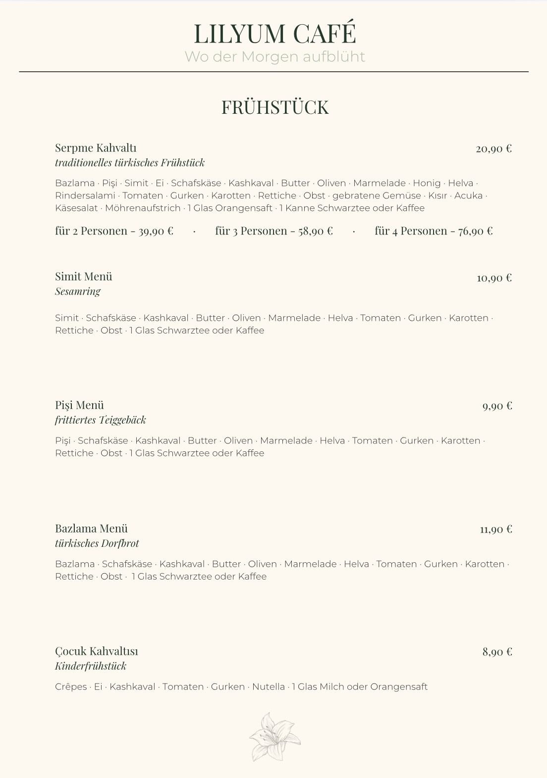 Beginnen Sie den Tag auf Lilyum-Art! Unsere Frühstückskarte ist eine Feier des morgendlichen Genusses, kreiert, um Ihre Geschmacksknospen zu wecken und Ihren Geist zu beleben. Genießen Sie unser reichhaltiges Angebot an Speisen, darunter auch ein authentisches türkisches Frühstück, das Sie auf eine kulinarische Reise mitnimmt. Begleiten Sie uns zu einem unvergesslichen morgendlichen Treffen, das den Ton für einen wunderbaren Tag setzt.